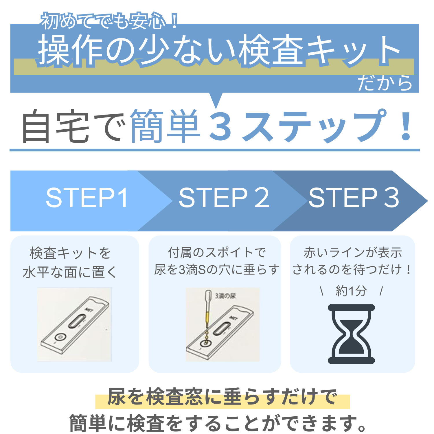 2. 附属のスポイトで3滴ずつ、キットの下側にある〇の穴に尿をたらして、水平な台の上に置きます。この時、検査窓には尿をたらさないように注意してください。