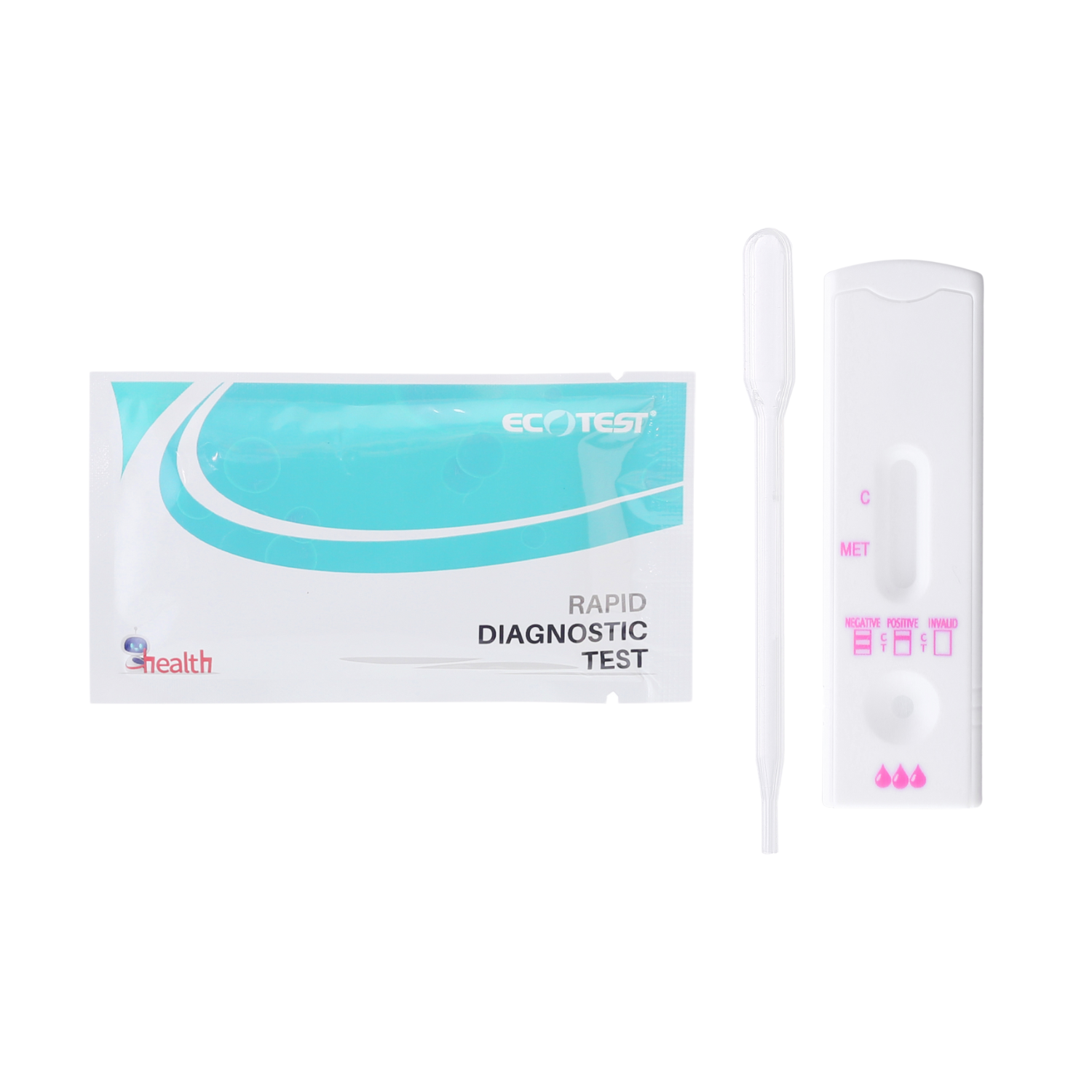 紙コップ等に採取した尿を付属のスポイトで3滴検査窓にたらします。このとき C、METの表示窓に尿をたらさないようにご注意ください。